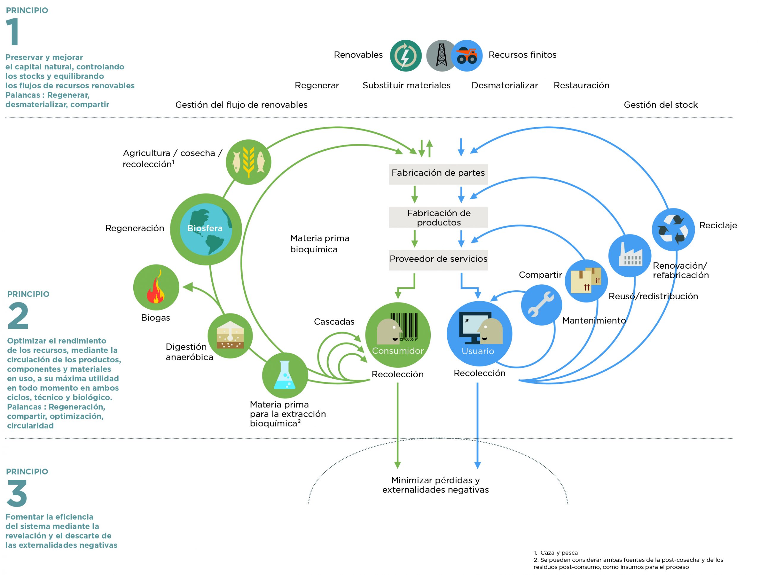 Cada una de ellas, contiene diversas acciones que incremental el uso de activos físicos, prolongan su vida y cambian el uso de los recursos de fuentes finitas a renovables. Cada acción refuerza a las demás, acelerando el rendimiento del proceso hacia una economía circular.